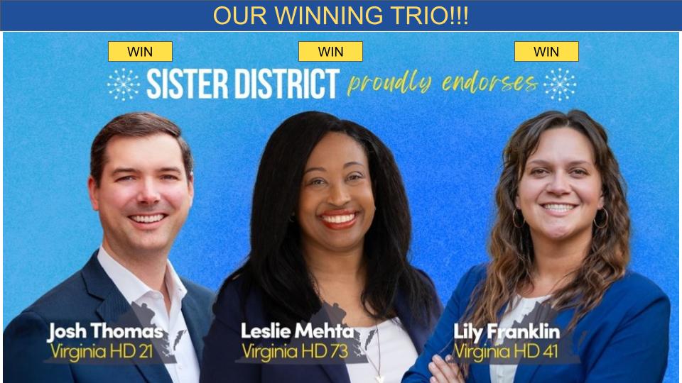 All States Win candidates won their House of Delegate races: eight (8) challengers flipped their seats and seven (7) incumbents held their blue seats. What about the three fantastic candidates whom we South Bay volunteers supported?